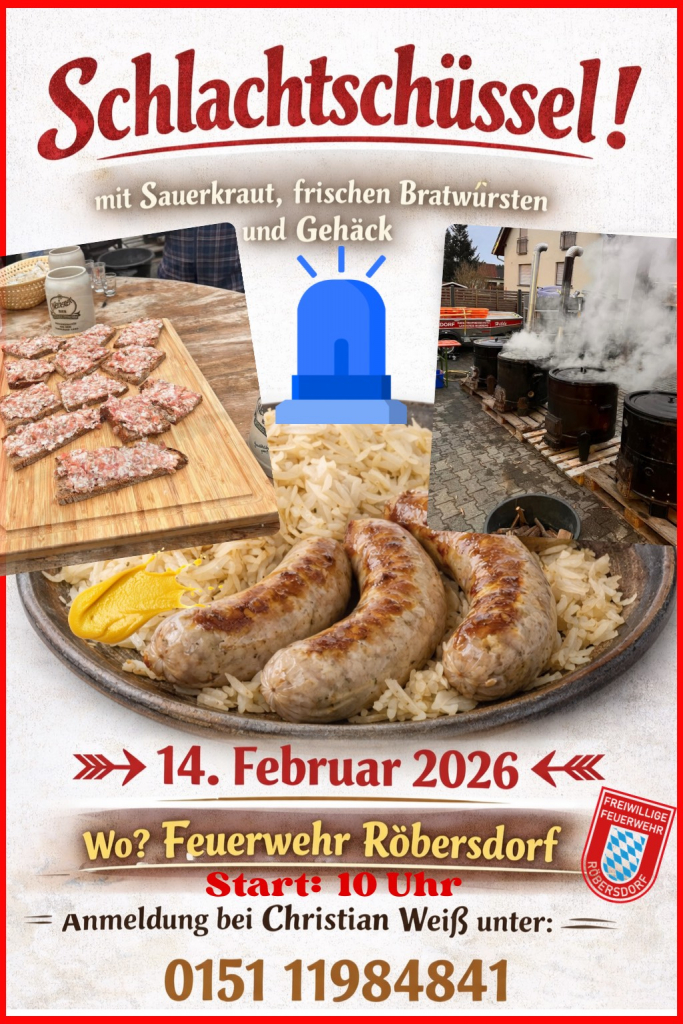 Einladung zur unserer öffentlichen Schlachtschüssel am Faschingssamstag, den 14. Februar 26 bei uns im Feuerwehrhaus. Ab ca. 10 Uhr werden wir dort frische Schlachtschüssel & Gehäck zusammen mit Sauerkraut & gegrillten Bratwürsten anbieten. Ebenso wird es frisches Fassbier geben. Die Einladung darf gerne breit gestreut werden und ist an die Gesamtbevölkerung gerichtet. Anmeldung bitte per WhatsApp oder SMS an [...]
